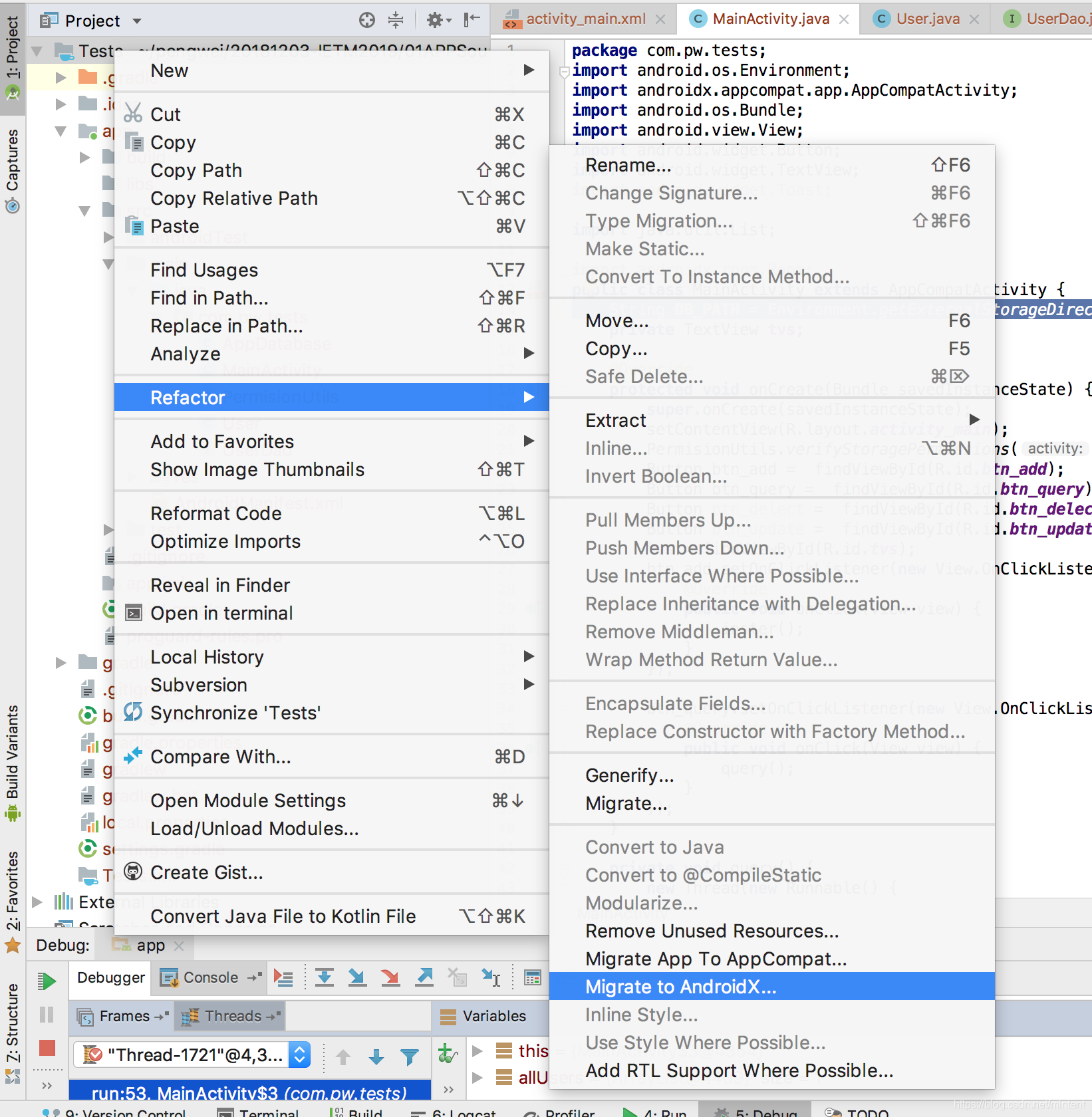 好的就这么简单,就ok了,当然如果你的项目用的是 kotlin ,那么配置只需要将 annotationProcessor 换成 kapt 当然 你还要添加kapt的配置,这里不多介绍。当然,配置完了rebuild的时候一定会报错,因为引用了androidx构建替代了android support所以导致了不兼容的问题,ok很简单,将我们需要变成androidx的依赖项转换过来就OK了嘛。首先鼠标选中我们的项目,右键,然后refactor—Migrate to Androidx 然后ok然后选中我们需要转换的项 refactor 就可以喽。解决了androidx与android support冲突问题喽。