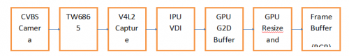 基于Linux V4l2架构的TW6865驱动程序用DMA抓取CVBS摄像头的数据;然后由飞思卡尔IMX6应用处理器的图像处理单元(IPU)对抓到的隔行CVBS图像进行解交织(De-interlace)处理得到去锯齿平滑后的图像;最后平滑后的4个摄像头图像用iMX6的GPU混合后显示到显示屏上。