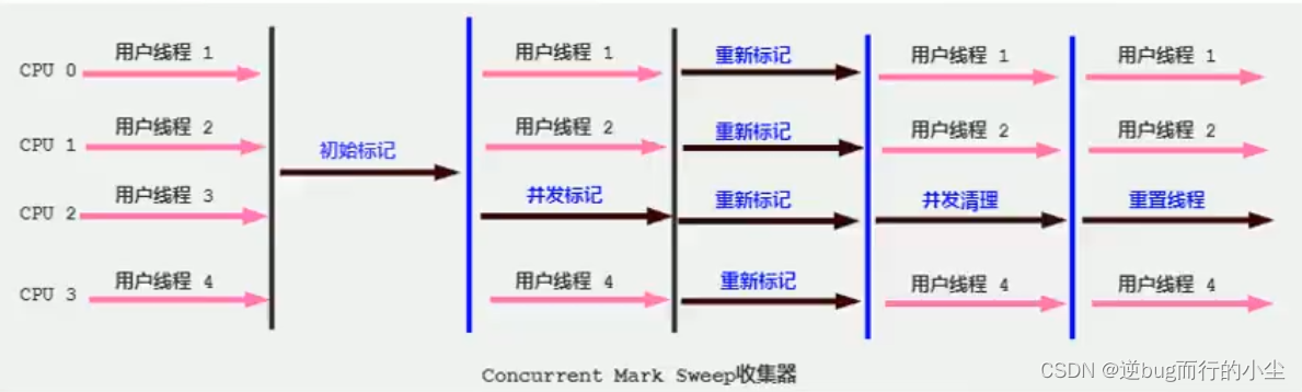 - 并发清除:清除删除掉标记阶段判断的已经死亡的对象,释放空间