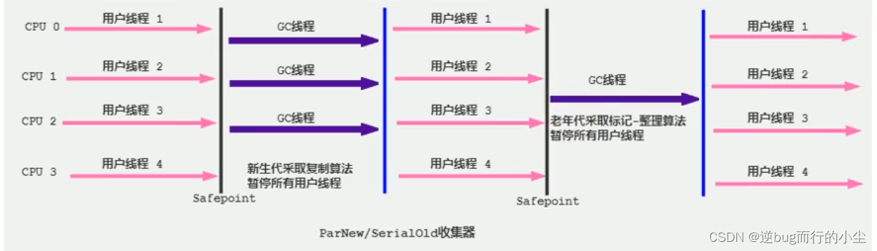 - 如果CMS运行期间预留的内存不足,则会出现溢出“Concurrent Mode Failure”,并临时启动Serial Old收集器重新对老年区进行垃圾收集(同时进行碎片整理)