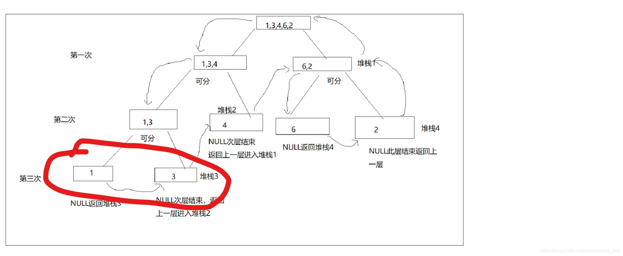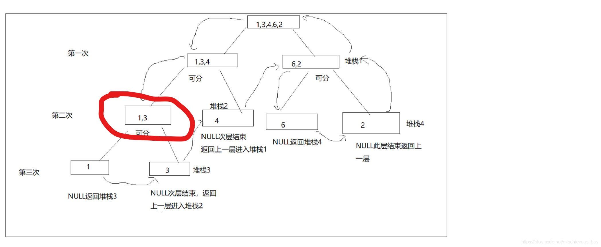 接着,我们要将左表进行递归排序,右表也进行递归排序,然后再将他们合并,就解决了递归的问题