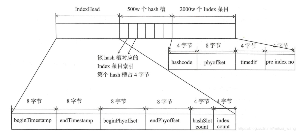 IndexHeader头部,包含40个字节,记录文件的统计信息,包括最小存储时间,最大存储时间,最小物理偏移,最大物理偏移,hashslot个数,index条目列表已经使用的个数