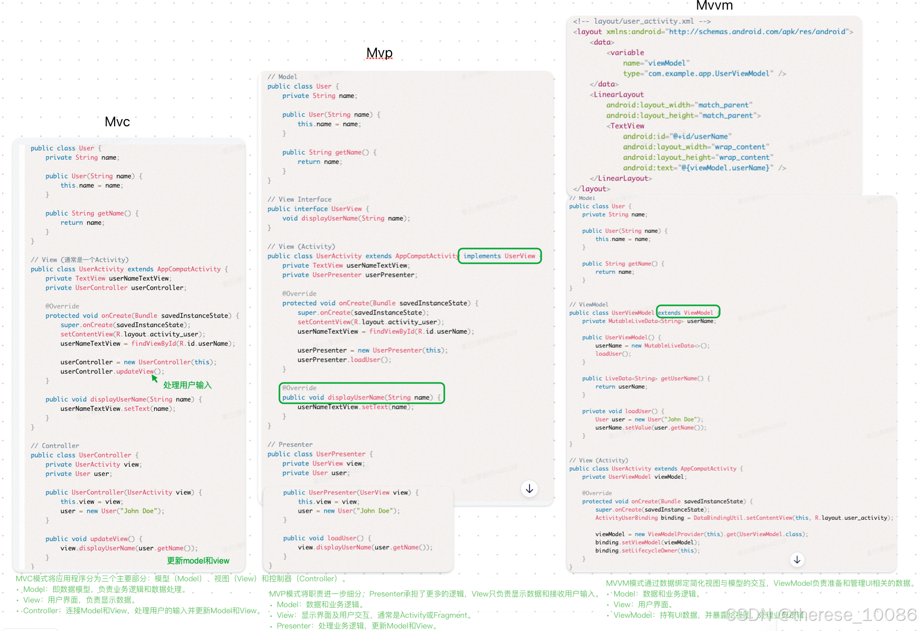 其中Mvvm为双向数据绑定,可以通过databinding完成,也可以使用观察者模式和接口callback的形式实现。