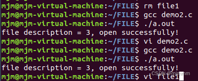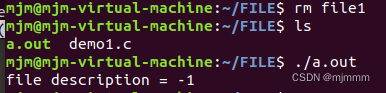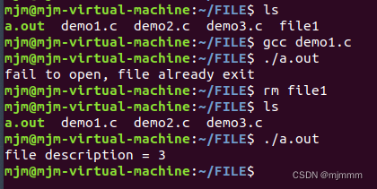 可见,当file1存在时,会返回-1,无法打开文件;只有将file1删除,才会正常返回文件标识符。