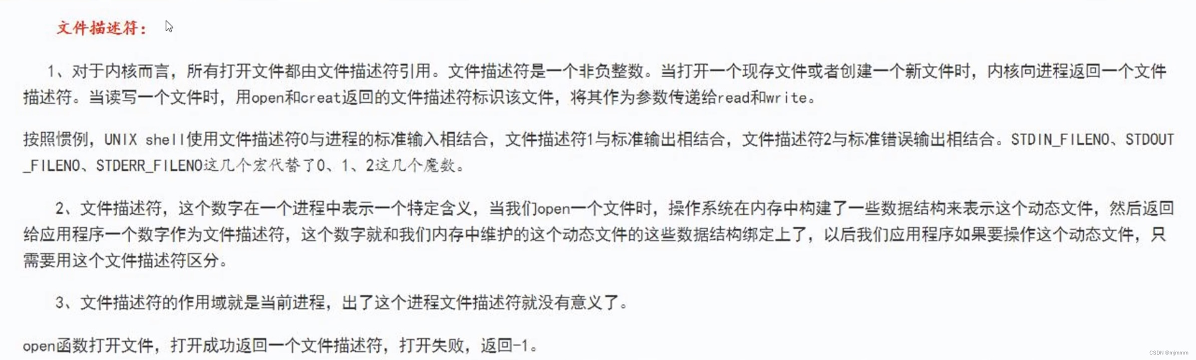 当调用open打开一个文档之后,open函数会返回一个非负整数,这个整数就是文件描述符