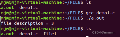在刚刚O_APPEND的实验中,file1的内容被修改成了“mjmmjm123”,现在修改demo2.c的代码,加入O_RRUNC参数,不删除file1的前提下编译运行 demo2.c: