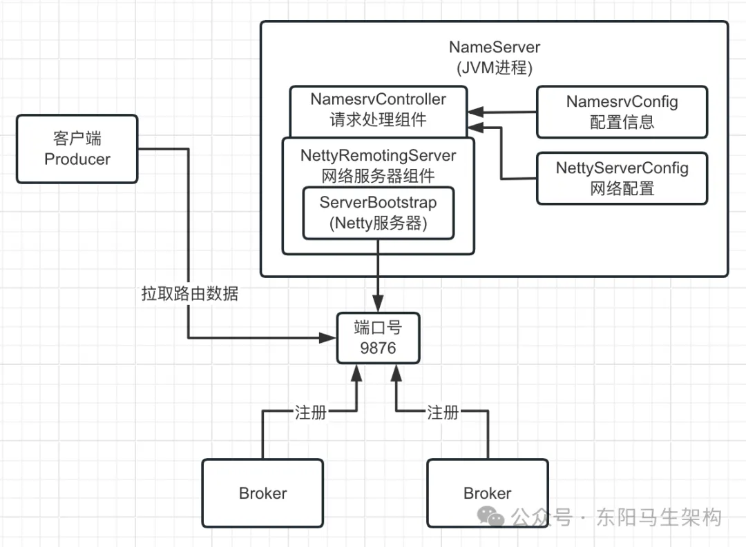 NameServer启动后,会有一个NamesrvController组件管理控制NameServer的所有行为,包括内部会启动一个Netty服务器去监听一个9876端口号,然后接收处理Broker和客户端发送过来的请求。