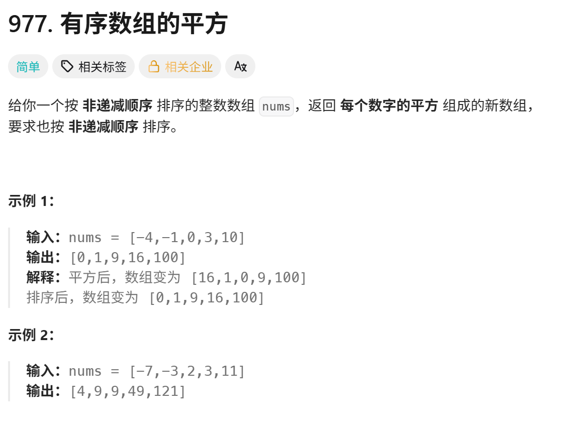 题目给定一个非递减顺序排列的整数数组 nums,要求返回每个元素平方后按非递减顺序排列的新数组。