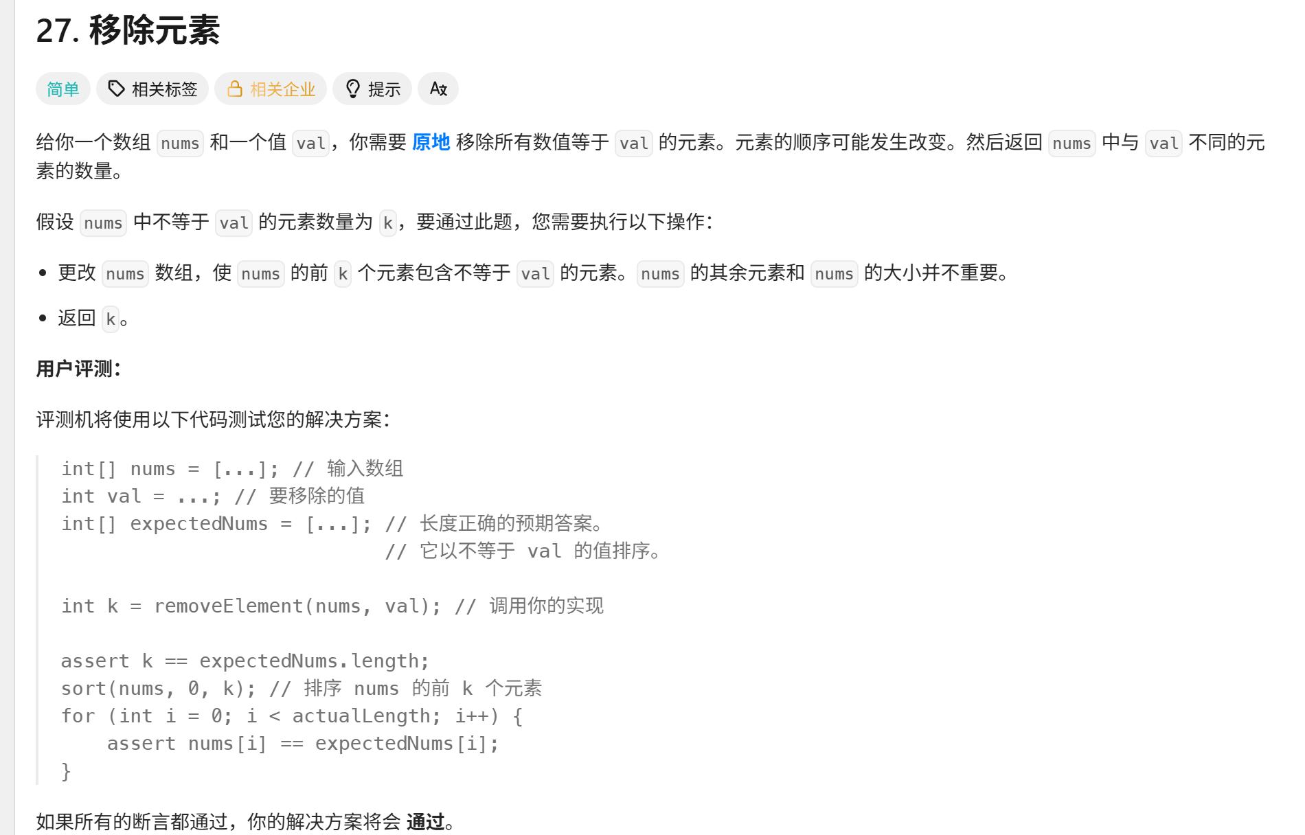 题目要求我们原地移除数组中所有等于给定值 val 的元素,并返回剩余元素的数量 k。移除后的数组前 k 个元素应为不等于 val 的元素,其余元素可以忽略。