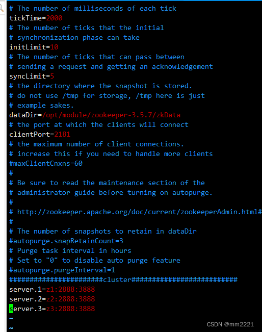 这里的z1,z2,z3也可以换成每个虚拟机具体的ip地址。这样写是因为已经在/etc/hosts文件中配置过了。