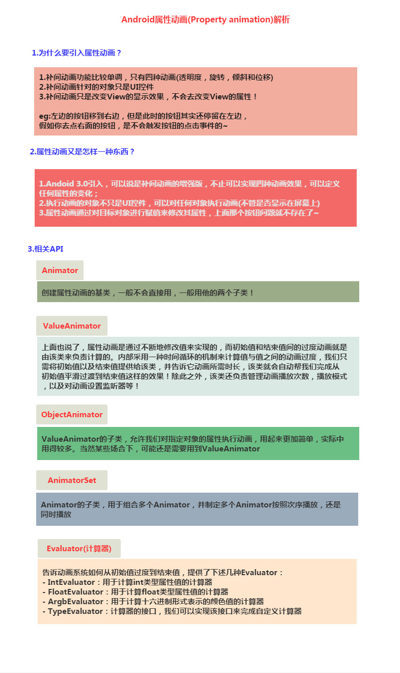 属性动画可以对任何对象的属性做动画而不仅仅是View,甚至可以没有对象。除了作用对象进行扩展外,属性动画的效果也加强了,不仅能实现View动画的4中效果,还能实现其它多种效果,这些效果都是通过ValuAnimator或ObjectAnimator、AnimatorSet等来实现的。
