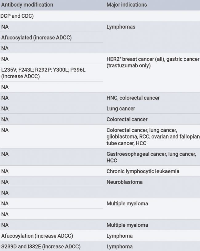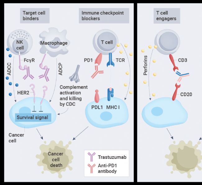 最早获得 FDA 批准的抗体是靶向 CD20 的 Rituximab 和靶向 HER2 的Trastuzumab,这两种抗体都使用共同的 IgG1 同种型。IgG1 诱导 ADCC 和 ADCP 最终导致癌细胞死亡,并且可以通过 Fc 工程进一步增强毒性作用,FcγR 对利妥昔单抗表现出更高的反应。IgG1 亚类还能够结合补体蛋白 C1q,导致补体依赖性细胞毒性 (CDC),致癌细胞死亡。
