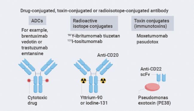 第三种主要形式涉及与有毒有效载荷相关的抗体,例如细胞毒性药物 (抗体-药物偶联物, ADC)、细菌或植物毒素 (免疫毒素) 或放射性同位素,它们增强了抗体杀死癌细胞的能力。ADC 是迄今为止使用最广泛的形式,而毒素偶联抗体和放射性同位素偶联抗体尚未得到广泛采用。
