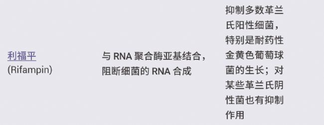 Rifampin 在细菌中的作用靶点是 DNA 依赖性 RNA 聚合酶的 β 亚基 (RNA 聚合酶由一个 α 亚基二聚体、一个 β 亚基、一个 β’ 亚基和一个 ω 亚基组成)。Rifampin 通过干扰 β 亚基与 DNA 的结合,从而抑制 mRNA 的产生,阻断 RNA 转录过程,使 DNA 和蛋白的合成停止,最终导致细菌死亡。