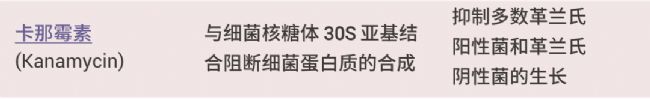 卡那霉素 (Kanamycin) 进入细胞后,可与 30S 核糖体亚基中的 16S rRNA 受体不可逆的结合, mRNA 密码子翻译成氨基酸的过程将受到影响,导致 tRNA (转运 RNA) 错误地将氨基酸插入多肽链中,从而产生无功能的蛋白质。这些异常蛋白质会在胞内积聚,产生剧毒,导致细胞停滞。