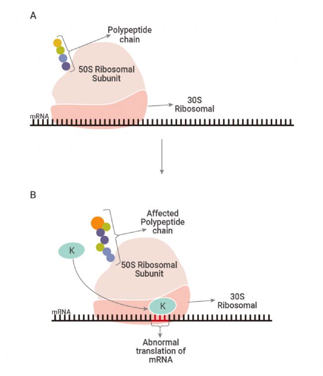 A. 核糖体中的正常翻译过程; B. 卡那霉素 (K) 影响翻译过程。