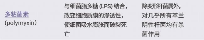 Polymyxin 可与革兰氏阴性细菌外膜的脂多糖结合,同时多粘菌素的疏水性脂肪酰基链和七肽环结构域插入外膜,并在外膜上形成孔状聚体,从而导致外膜渗透。随后多粘菌素分子插入磷脂双分子层,破坏细胞膜的完整性,导致内膜破裂、细胞内液外渗和细胞死亡。