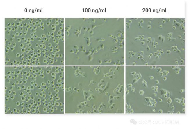 PMA 处理 24 h 后细胞由悬浮生长变为贴壁生长,高倍镜下可看到部分细胞的胞浆里含有大量颗粒状物质,同于之前的透亮状态; 可观察到细胞变得更扁平,呈不规则形,部分细胞有伪足伸出,贴壁呈阿米巴样生长。(已经过 MCE 生物实验验证)。