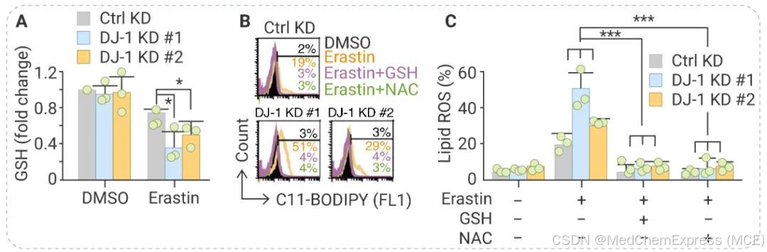 在 DJ-1 suppresses ferroptosis through preserving the activity of S-adenosyl homocysteine hydrolase 一文中,作者探究了 DJ-1 负调节铁死亡的机制。研究发现,用 RNA 干扰抑制 DJ-1 表达可以与 Erastin 协同抑制细胞内 GSH 水平 (图 7A)。同时,添加外源性 GSH 或 N-乙酰半胱氨酸 (NAC) 可以逆转 Erastin 诱导的脂质 ROS 积累 (图 7B) 和细胞死亡 (图 7C)。因此,作者推测 DJ-1 可能会影响 GSH 的合成从而抑制铁死亡[7]。