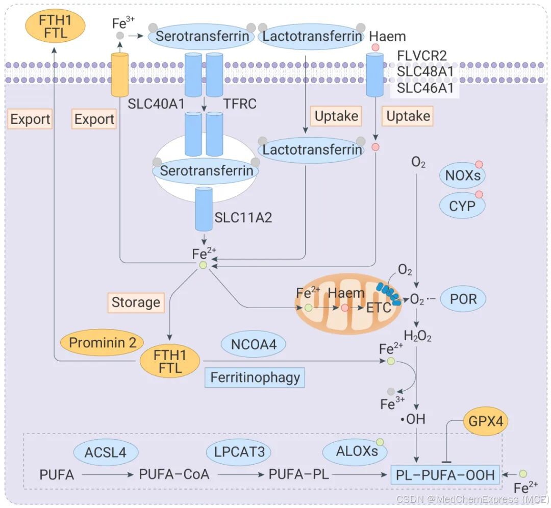 铁积累 (如增加铁吸收、减少铁储存和限制铁外流)可以促进铁死亡 (具体可见: 铁死亡是什么,如何检测?您要的“一文通”来了!)。过量的铁通过至少两种机制促进随后的脂质过氧化:通过铁依赖性 Fenton 反应产生活性氧 (ROS) 以及激活含铁酶。