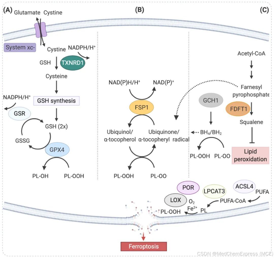 游离多不饱和脂肪酸是合成脂质信号转导介质的底物,但它们必须被酯化成膜磷脂并被氧化才能传递铁死亡信号。脂氧合酶 (LOX) 和细胞色素 P450 氧化还原酶 (POR) 通过脂质的双氧合启动脂质过氧化。研究表明,磷脂酰乙醇胺是诱导细胞铁死亡的关键磷脂。酰基辅酶 A 合成酶长链家族成员 4 (ACSL4) 和溶血磷脂酰胆碱酰基转移酶 3 (LPCAT3) 参与磷脂酰乙醇胺的生物合成和重构,激活多不饱和脂肪酸并影响其跨膜特性。因此,降低 ACSL4 和 LPCAT3 的表达可减少细胞内脂质过氧化物底物的积累,从而抑制铁死亡。