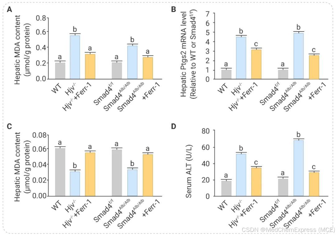 在遗传性血色素沉着症 (HH,一种铁超负荷疾病) 与铁死亡的关系研究中,为了证实铁死亡在 HH 相关肝损伤中的作用,作者用铁死亡抑制剂 Fer-1 治疗 Hjv–/– 小鼠 (经典的 HH 小鼠模型) 和 Smad4 Alb/Alb 小鼠 (HH 样小鼠模型) 三周。如图 6 所示,与对照组小鼠相比,经 Fer-1 处理的小鼠肝脏 MDA 水平显著降低,NADPH 水平增加。此外,Fer-1 可以降低小鼠血清 ALT 水平胶原蛋白沉积。结果表明,铁超载会诱导 HH 小鼠的铁死亡[6]。