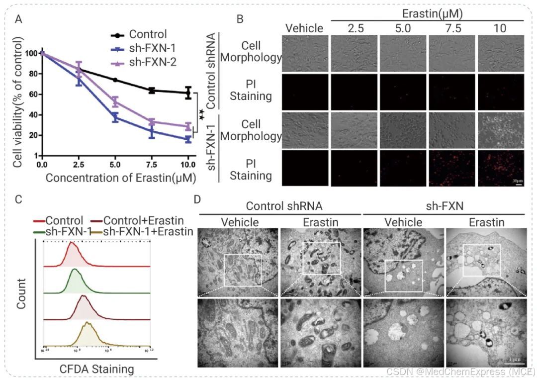 如在 Identification of Frataxin as a regulator of ferroptosis 一文中,作者研究抑制 Frataxin (FXN) 是否会促进铁死亡。用 Erastin 同时处理 FXN 敲低和对照细胞,12 小时后用 CCK8 法检测细胞活力,结果表明抑制 FXN 表达显著增强了 Erastin 诱导的细胞死亡。同时碘化丙啶 (PI) 和 CFDA-SE 染色结果以及用透射电镜观察到的线粒体碎裂、空泡化和嵴增大都表明 FXN 耗竭协同 Erastin 诱导铁死亡[3]。