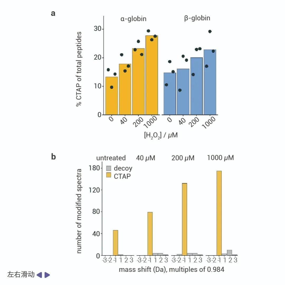a. 氧化损伤导致体外 CTAP 的形成。b. 基于质谱/质谱法测定血红蛋白中 CTAP 的体外形成。c. 在公开的人类蛋白质组学数据中检测到的 CTAP 与体外氧化损伤的比较。
