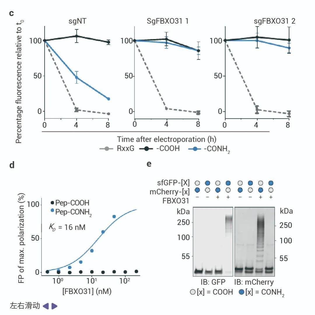 a. 全基因组 CRISPR 筛选示意图,以确定 CTAP 清除所需的基因。b. CRISPR 筛选结果。c.在 FBXO31 敲除和对照细胞中 sfGFP 降解时间对比。d. 荧光偏振实验结果。e. 用 sfGFP-pep1 和 mCherry-pep2 进行体外泛素化检测。