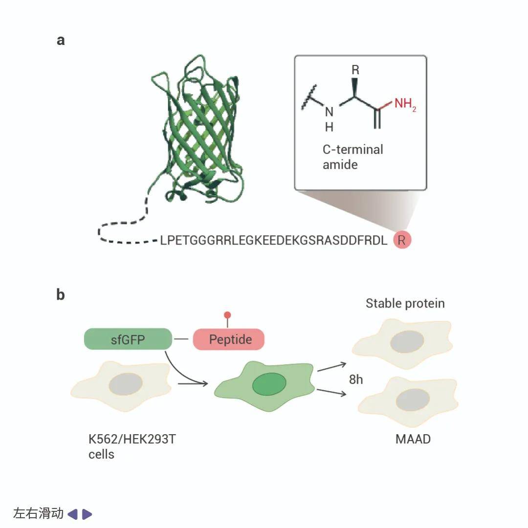 研究人员通过构建半合成荧光蛋白报告系统,系统性地分析了不同修饰对蛋白质降解的影响。他们发现,C 端酰胺化的蛋白质在细胞内的降解速率明显快于未修饰的蛋白。