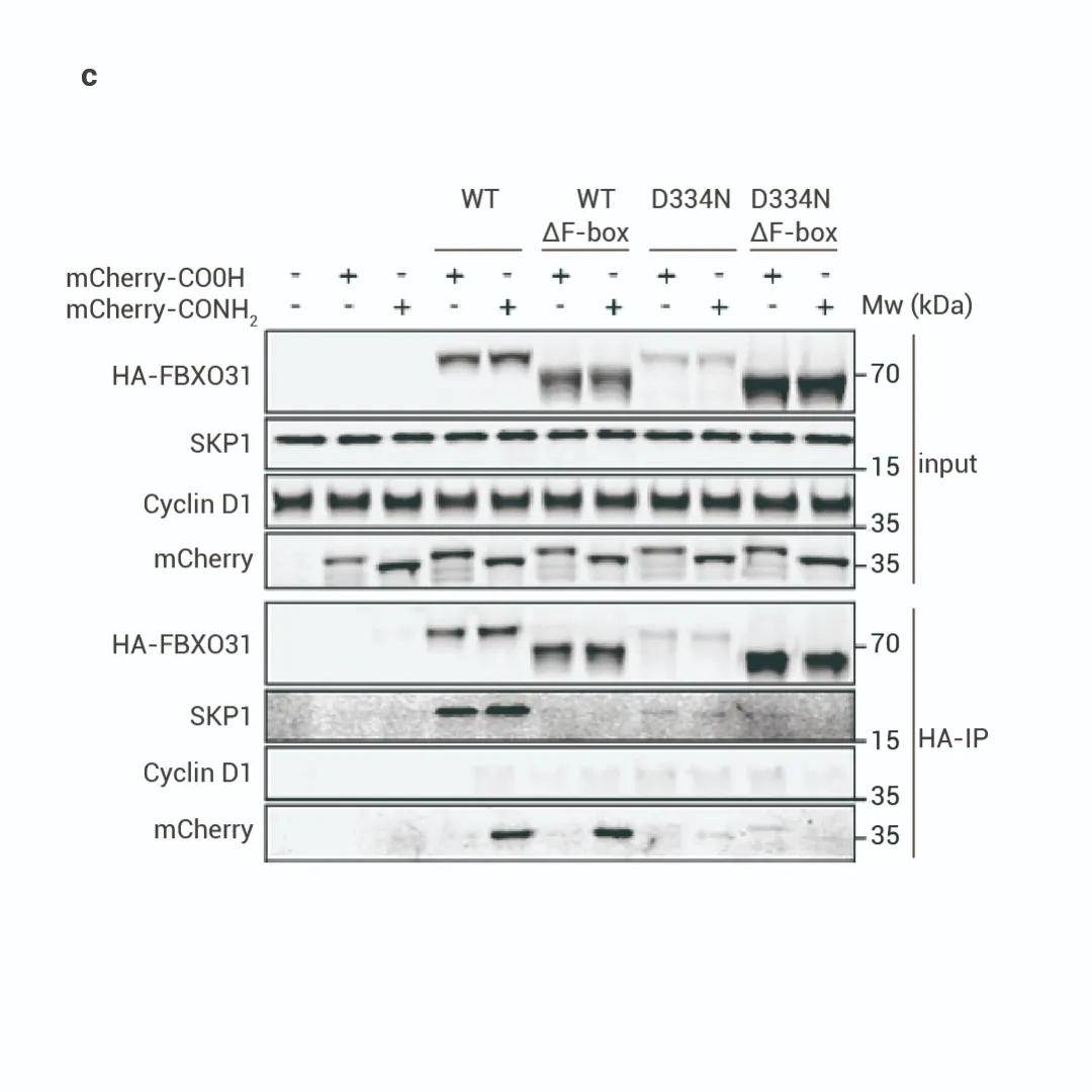 为了找到识别 C 端酰胺修饰的关键因子,研究团队利用 CRISPR 筛选技术,最终锁定了 FBXO31 蛋白。FBXO31 是 SCF 复合体 (SKP1-CUL1-F-box 蛋白) 的一个底物受体,它能够特异性地识别 C 端酰胺并介导其泛素化。