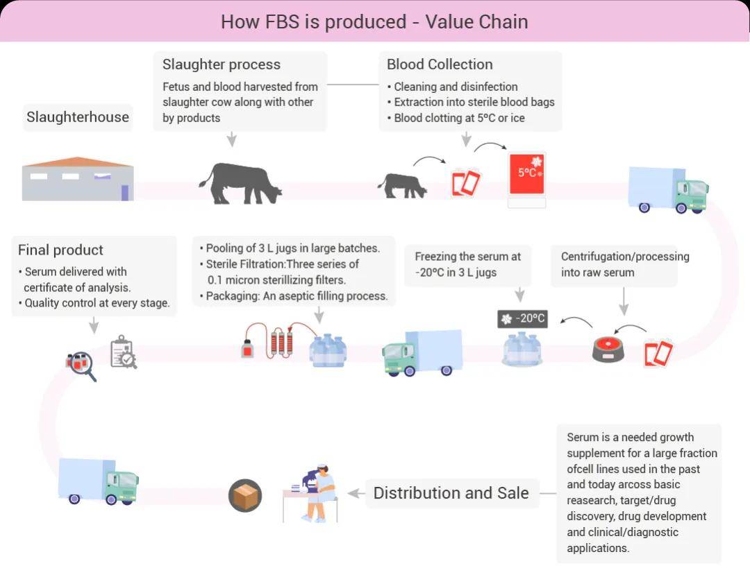 血清生产流程:血液采集 → 凝固分离 → 三级过滤 → 质检分装 → 冷链配送。
