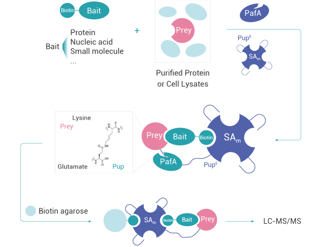当靶蛋白 (Prey) 与带有生物素标记的诱饵分子 (Bait) 发生相互作用时,会同时与生物素偶联上的 SAm-PupE 靠近,在 PafA 酶的催化作⽤下,PupE 的 C 末端会与 Prey 蛋白表面的赖氨酸残基共价相连,从而实现对靶蛋白的捕获。该过程可以将生物分子与蛋白质之间的非共价结合相互作用转换为 SAm-PupE 与靶蛋白的共价连接,从而能够稳定地用于后续靶蛋白的富集、鉴定和分析。