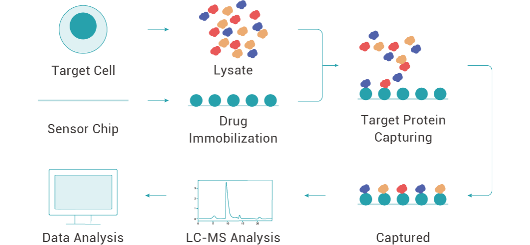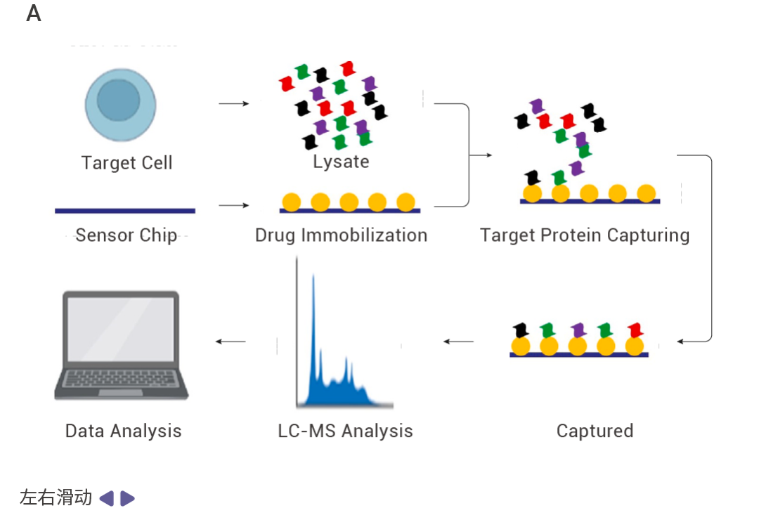 实验时,将药物固定在芯片上,蛋白裂解液稀释为不同浓度,采用多浓度上样的方式,将不同浓度的裂解液与药物互作,收集与小分子结合的蛋白并通过高分辨质谱进行鉴定,从而得到药物的潜在靶蛋白。同时,SPR 技术也常用于靶蛋白与药物的亲和力验证。