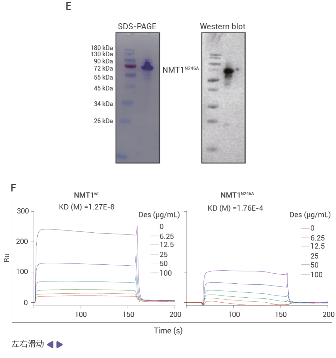 作者通过表型筛选及验证发现药物 desloratadine 在体内和体外实验中都能够显著抑制肝细胞癌 (HCC) 的生长和增殖。为了探究 desloratadine 发挥抗癌生物活性的分子机制,作者通过 DARTS 实验发现了 53 种潜在靶蛋白,并从中选择了 5 种感兴趣的蛋白质修饰酶进行进一步研究。通过蛋白表达、Knockdown、细胞增殖、细胞侵袭和迁移以及体内实验等验证了 desloratadine 通过靶向 NMT1 蛋白调节 HCC 的发展,利用 SPR 技术验证了 desloratadine 和 NMT1 蛋白的结合,通过分子对接、蛋白点突变联合 SPR 技术找到了 desloratadine 和 NMT1 蛋白的结合位点。