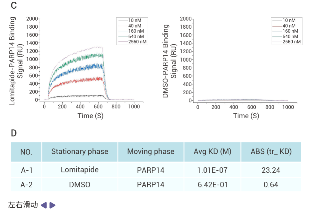 为了确定 lomitapide 的潜在靶点,作者利用 SPR 结合 HPLC-MS 筛选得到 39 个可以与 lomitapide 结合的蛋白,并选择了 MS 分析排名第 1 位的 PARP14 蛋白进行验证。通过 SPR 实验证实 lomitapide 与 PARP14 蛋白能够直接结合 (Kd = 101 nM),并在后续实验中利用 knockout 证实 Lomitapide 通过靶向 PARP14 诱导 MM 线粒体功能障碍和线粒体自噬,从而揭示了 Lomitapide 对抗 MM 的新机制。
