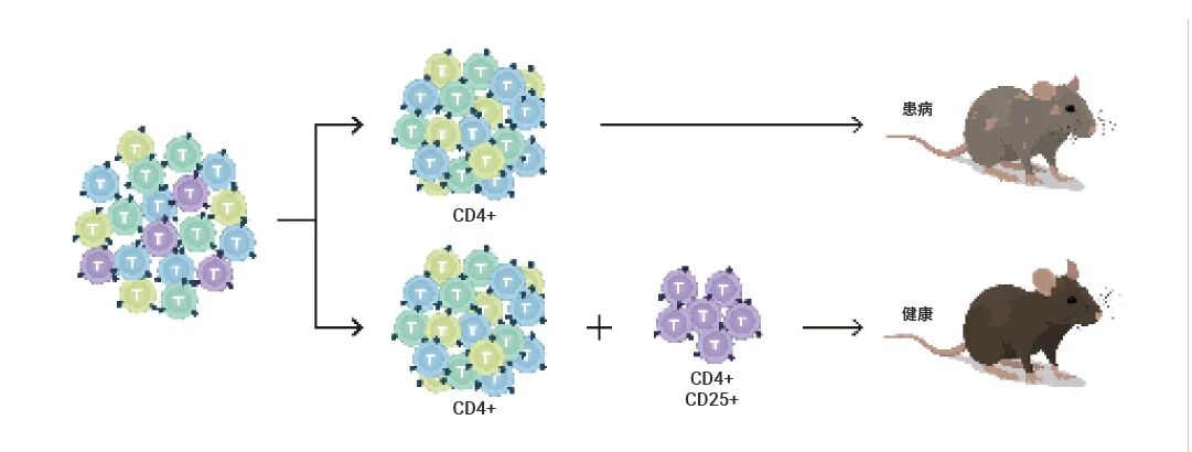 历经十多年的时间,Sakaguchi 通过一项针对缺乏 T 细胞的小鼠的实验,证明表面带有 CD25 的 T 细胞能够预防自身免疫性疾病 (图 3)。