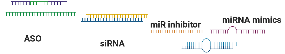RNA 干扰是一种通过 RNA 分子介导的基因沉默机制,相较于常规的抑制剂,RNA 干扰技术具有无靶点限制、特异性强、生物毒性低等优点。常见的应用于 RNA 干扰的寡核苷酸有小干扰 RNA (siRNA)、微小 RNA (miRNA) 和反义寡核苷酸 (ASO) 等 (图 1) ,其基本原理是利用 siRNA、miRNA 或 ASO 与特定的目标基因 mRNA 序列相互作用,从而诱导靶基因的降解或抑制其翻译,进而实现对特定基因的沉默或抑制。