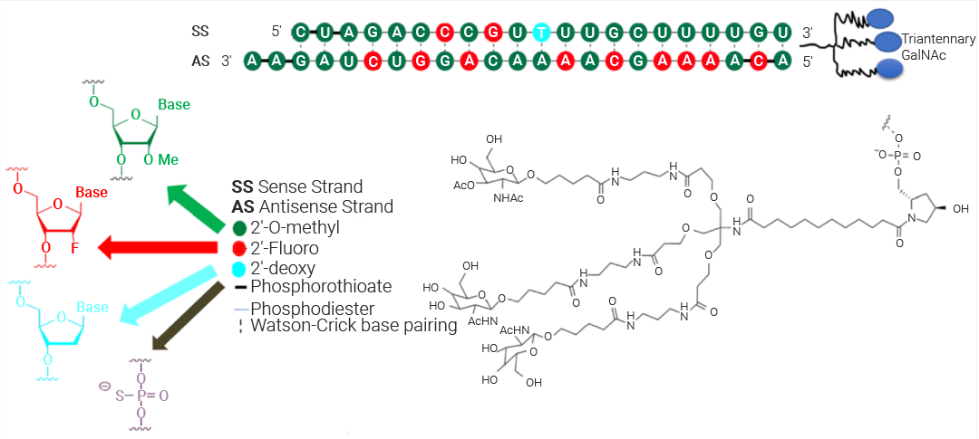 图 3. 因克西兰的化学结构:N-乙酰半乳糖胺(GalNAc)偶联介导的肝靶向递送。GalNAc 三聚体是典型的修饰方法[2]。