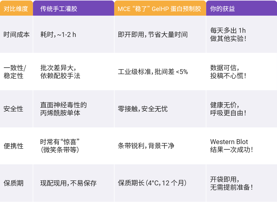 你你你还在配胶翻车吗?漏胶、气泡、手抖、配方记混……说多了都是泪!MCE「稳了」系列 GelHP 蛋白预制胶,正式出道!专治各种 "实验 PUA",把你从制胶地狱拽回科研乐园!