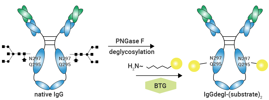 mTGase 可以特异性识别去糖基化 IgG 抗体 Fc 区域的 Q295 位点,并将其作为修饰位点与适配底物相结合。通常先利用 PNGase F 进行去糖基化处理,然后再与带氨基的底物发生反应,以此实现偶联[1]。