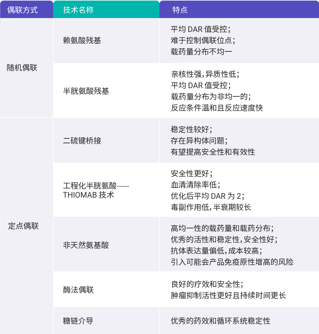 而定点偶联技术包括引入反应性半胱氨酸偶联 (Thio - mab) 技术、链间二硫键改造、非天然氨基酸偶联技术、酶法偶联、糖基偶联等。与随机偶联相比,定点偶联得到的 DAR 较为明确,最终成品的一致性更高。