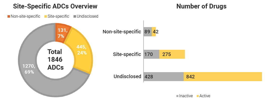 在已披露的 576 款 ADC 中,采用定点偶联技术的有 445 款 (占比 77%),占据绝对优势;非定点偶联的仅有 131 款 (占比 23%)。在定点偶联 ADC 管线中,61% 处于活跃开发状态,而非定点管线中仅有 32% 保持活跃。由此可见,定点偶联技术正在加速渗透 ADC 管线。