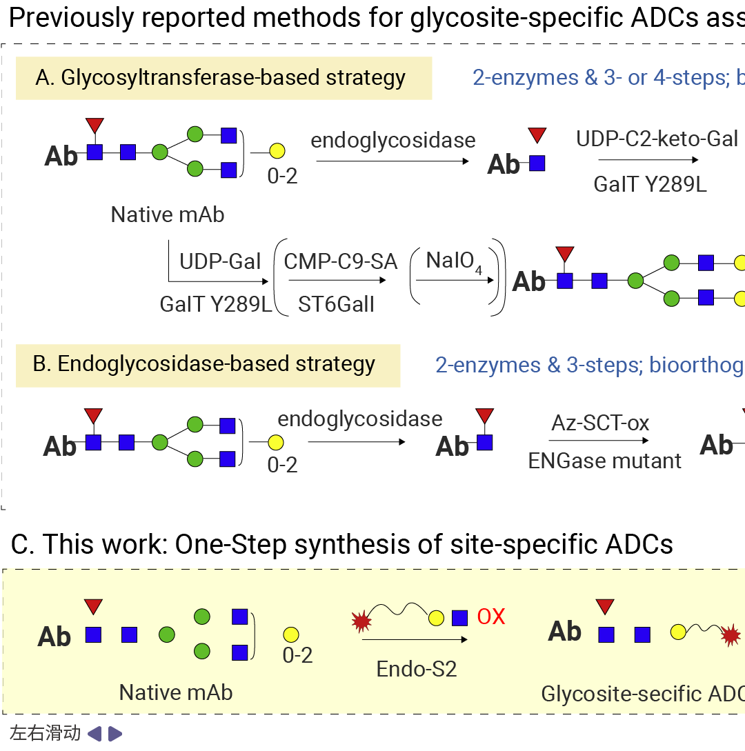 常见路径为:先运用糖苷内切酶 (如endo s、endo s2、endo SH 等) 对抗体 N - 297 位的糖进行酶切,再利用糖基转移酶 (如GalT(Y289L)) 引入叠氮基,最后通过叠氮与环辛炔反应形成稳定的 ADC。糖基偶联的详细内容可参考往期。