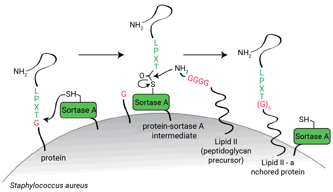 Sortase A (SrtA)是一类由革兰氏阳性菌 (如金黄色葡萄球菌、链球菌等) 分泌的转肽酶。这类酶能够识别特定的氨基酸序列,并催化其与细胞壁或细胞膜形成共价连接。