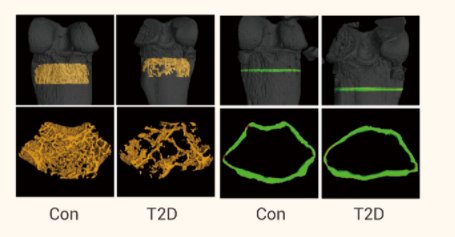 4 周龄雄性 C57BL/6 小鼠经高脂饮食喂养一个月后,腹腔注射60 mg/kg STZ,小鼠空腹血糖水平超过 11.1 mmol/L 则表明成功建立了 T2DM 小鼠模型。微型 CT 图像显示小鼠骨体积/组织体积骨小梁厚度、骨小梁数量均显著降低,骨小梁间距、骨表面积/骨体积、皮质骨 BS/BV 均显著增加。