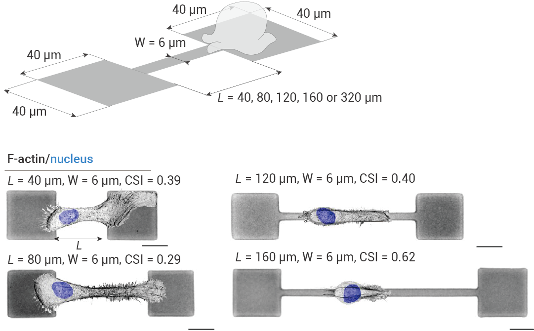 图 1."哑铃"微图案实验系统与细胞形态[2]。