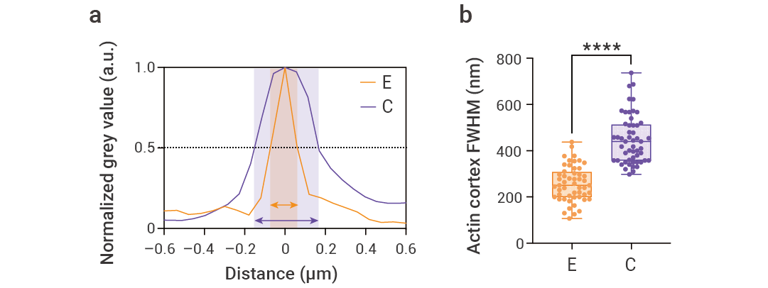 为了探究记忆的物理基础,研究者使用超高分辨率显微镜测量了细胞皮层的厚度。通过分析皮层处肌动蛋白的荧光信号分布宽度 (FWHM),确证压缩态细胞的皮层厚度显著大于伸长态细胞[2]。