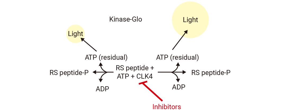 Kinase-Glo 是一种均质的非放射性的方法,激酶反应结束后,加入等体积的 Kinase-Glo 试剂,试剂中的萤光素酶会利用反应体系中剩余的 ATP 产生化学发光信号,从而定量地检测纯化激酶的活性,信号强弱与激酶活性成反比[4][5]。Kinase-Glo 法几乎适用于任何底物为 ATP 的酶的检测,且操作简单,无需洗涤,适合大规模筛选。