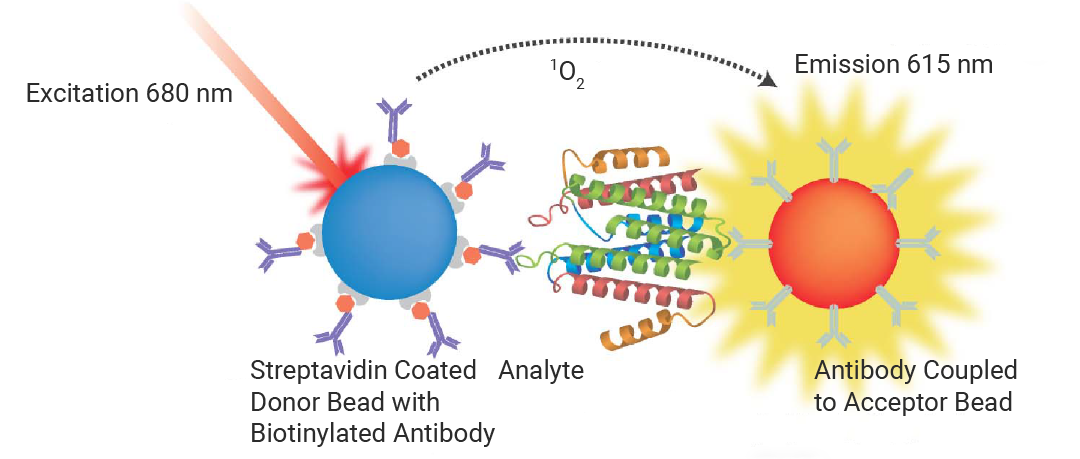 AlphaScreen 与 AlphaLISA 技术的核心在于独特的“单线态氧通道能量转移”体系:供体微珠在 680 nm 激光激发下产生单线态氧,这种高能分子可在溶液中扩散约 200 nM;只有当生物相互作用将供体与受体微珠拉近至此“作用距离”内,受体微珠才能接收能量并触发内部荧光团发光。